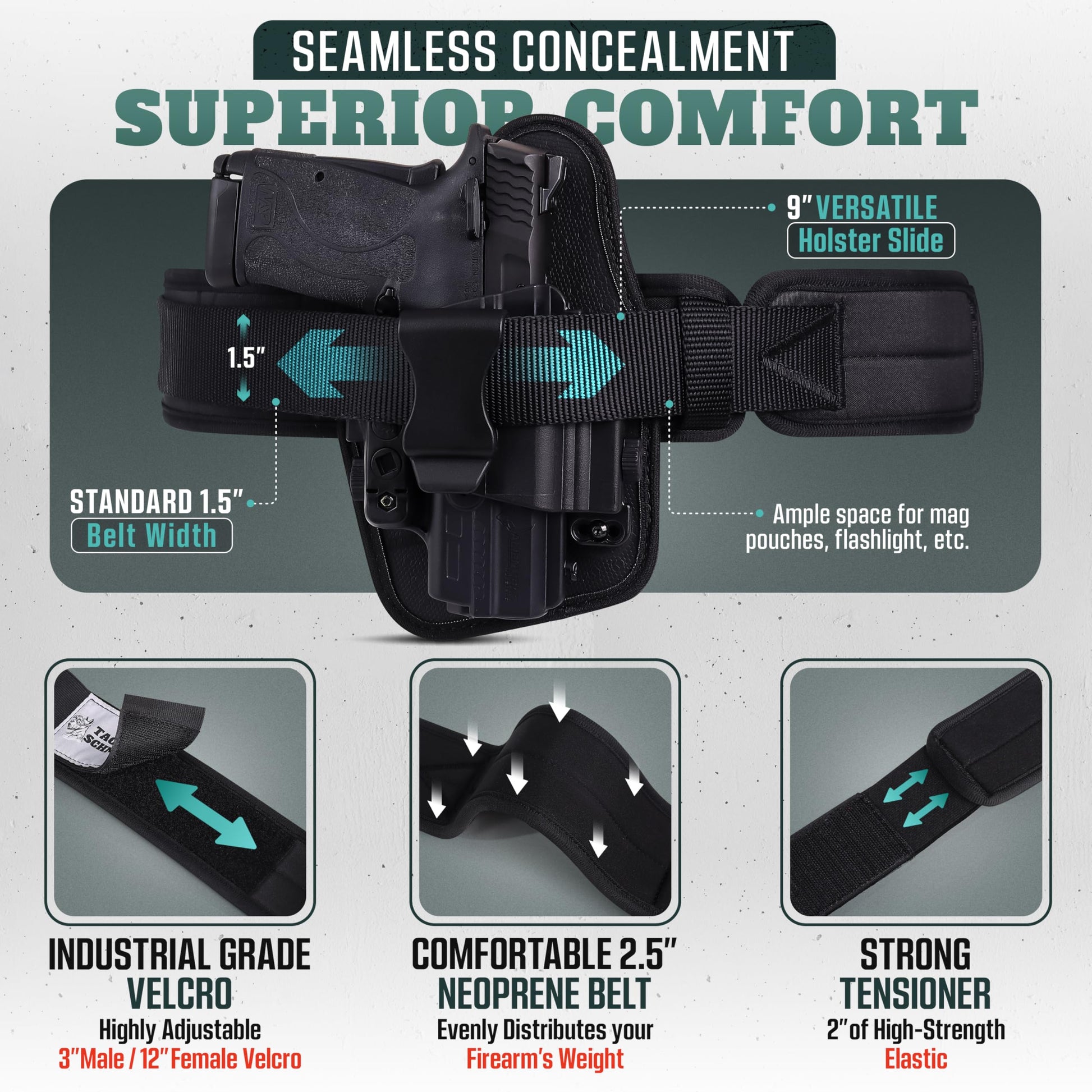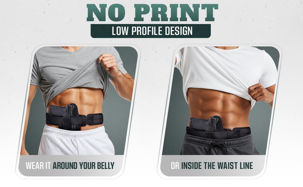 Unlike belly bands made from flimsy elastic, our system is designed to integrate securely with any holster up to 9" wide—giving you the trigger protection and retention your firearm demands. No more worrying about soft material pressing into your trigger guard. This is next-level carry confidence.
